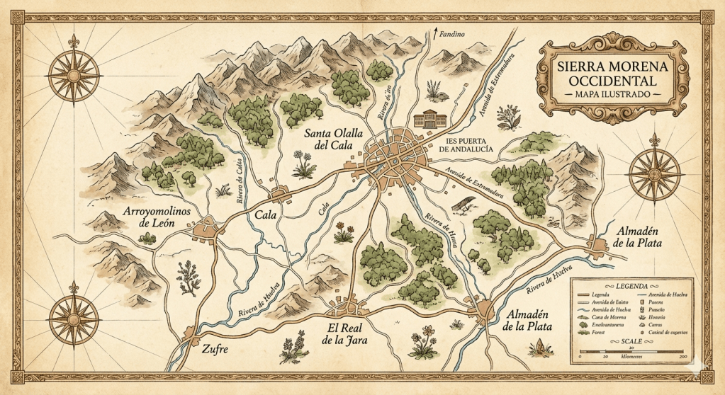 El IES Puerta de Andalucía está en Santa Olalla del Cala y es el nexo de unión para los jóvenes de Cala, Arroyomolinos de León, El Real de la Jara, Zufre y Almadén de la Plata. Estamos en un entorno rural en el que los valores tradicionales todavía perviven, pero los combinamos con una enseñanza innovadora, moderna y comprometida.